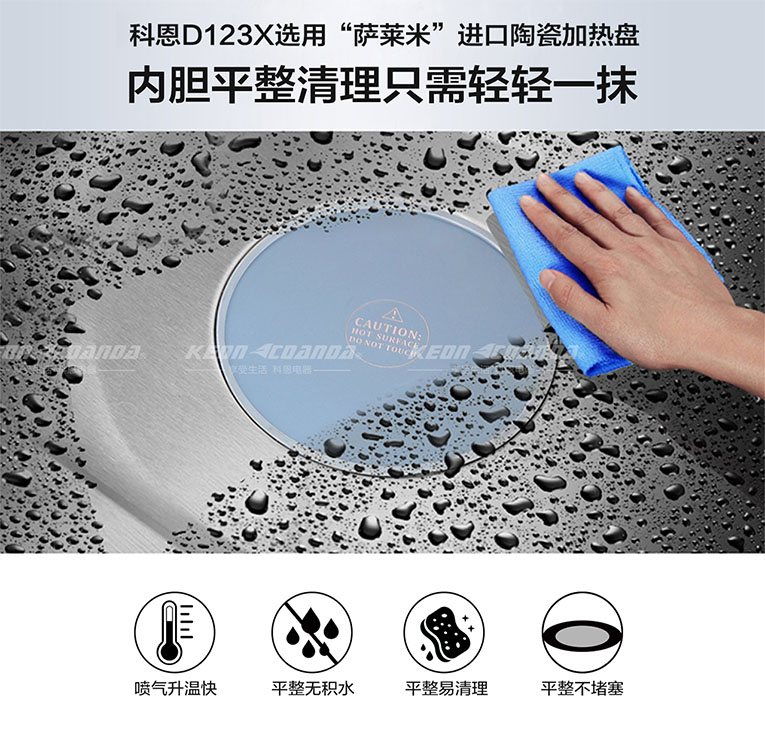 集成灶十大品牌、廚電行業十大品牌科恩D123X變頻蒸烤消一體集成灶采用噴氣式4D立體蒸,升溫僅需200秒,62L大容積蒸箱內腔頂部兩組加熱管,四面受熱均勻,有效防止了蒸汽上升,另外,底部陶瓷加熱盤噴氣升溫快、平整無積水、易清理、不堵塞,有效避免了傳統蒸盤在蒸制過程中排水孔容易堵塞導致故障的問題,且內膽平整清理只需輕輕一抹就能潔凈。