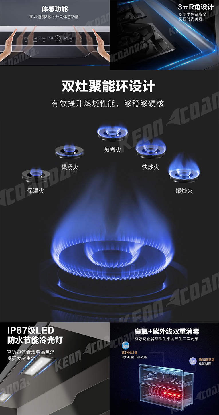 520告白季,科恩D520煙灶消款集成灶前來(lái)助陣,低空近吸體感操控,按風(fēng)俗健3秒可開關(guān)體感功能,3πR角設(shè)計(jì),既防水保證安全,又顯高端時(shí)尚,雙灶聚能環(huán)5.0KW強(qiáng)大火力,爆炒更有勁,煲湯更有味,1-99分鐘自由選擇,烹飪完成時(shí)自動(dòng)熄火,開關(guān)紅外線2秒延時(shí),防止了誤觸,同時(shí)產(chǎn)品采用一鍵自動(dòng)清洗,減輕你美麗雙手負(fù)擔(dān),內(nèi)部一鍵自動(dòng)清潔。消毒柜采用臭氧+紫外線雙重消毒,有效防止了餐具滋生細(xì)菌產(chǎn)生的二次污染,西門子冰箱門拉手,貼心高氧化鈦合金材質(zhì),耐用又好看!愛她,就要保護(hù)她,科恩D520集成灶,給她全方位的守護(hù)!
