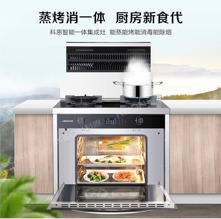 集成灶十大品牌、廚電行業(yè)十大品牌科恩變頻大吸力蒸烤消一體集成灶多種模式任你選擇,蒸煮煎炸炒燉樣樣精通,精準(zhǔn)溫控精控火候,鎖住每一份原汁原味,輕松樂享智慧烹飪,實(shí)現(xiàn)更高效、節(jié)能、多樣化模式。