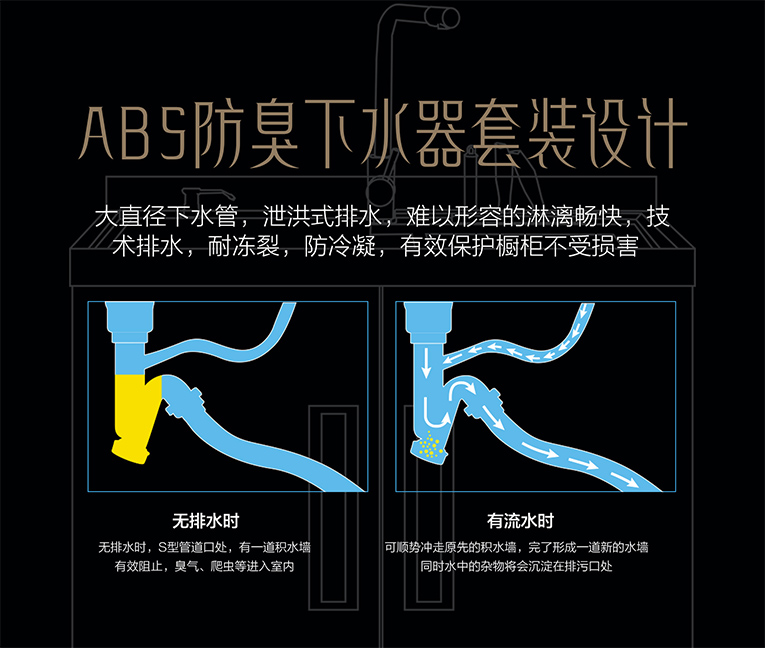 集成灶十大品牌、廚電行業十大品牌科恩X1集成水槽之所以備受消費者喜愛,用料安全、質量好、安全性高是一大原因,主要采用304食品級不銹鋼材質,在長期高溫潮濕的環境下,不會出現有害物質,不產生異味,與普通的不銹鋼相比更安全!另外,X1下水系統采用ABS防臭下水器套裝設計,大直徑下水管泄洪式技術排水,耐凍裂防冷凝,有效保護櫥柜不受損害。