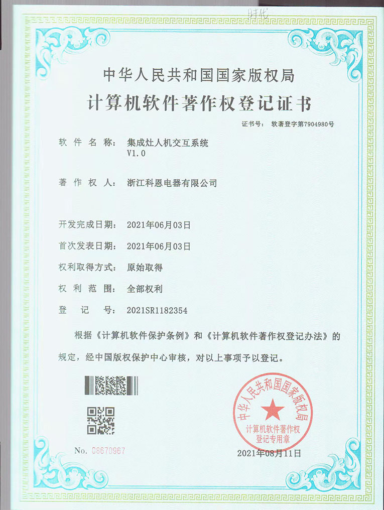 近日,由浙江科恩電器有限公司完全自主研發的集成灶人機交互系統V1.0軟件正式獲得國家版權局頒發的計算機軟件著作權登記證書。計算機軟件著作權是企業核心自主知識產權,是企業的“無形資產”,是企業科技的生命力和價值所在。同時,國家權威部門的認證將使搭載這些軟件的產品價值倍增。此次集成灶十大品牌、廚電行業十大品牌科恩集成灶獲得計算機軟件著作權,充分展現了企業強大的研發實力和核心競爭力。