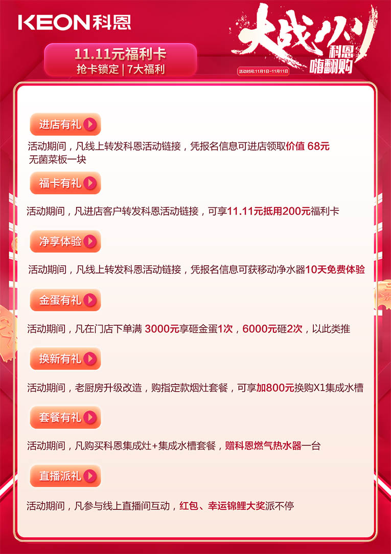 大戰(zhàn)雙11,科恩嗨翻購,11月1日——11月11日活動期間,前往科恩全國門店提前搶購11.11元福利卡,就能提前鎖定7大福利。進店有禮:活動期間,凡線上轉(zhuǎn)發(fā)科恩活動鏈接,憑報名信息可進店領(lǐng)取價值68元無菌菜板一塊;福卡有禮:活動期間,凡進店客戶轉(zhuǎn)發(fā)科恩活動鏈接,可享11.11元抵用200元福利卡;凈享體驗:活動期間,凡線上轉(zhuǎn)發(fā)科恩活動鏈接,憑報名信息可獲移動凈水器10天免費體驗;金蛋有禮:活動期間,凡在門店下單滿3000元享砸金蛋1次,6000元砸2次,以此類推;換新有禮:活動期間,老廚房升級改造,購指定款煙灶套餐,可享加800元換購X1集成水槽;套餐有禮:活動期間,凡購買科恩集成灶+集成水槽套餐,贈科恩燃氣熱水器一套;直播派禮:活動期間,凡參與線上直播間互動,紅包、幸運錦鯉大獎派不停。