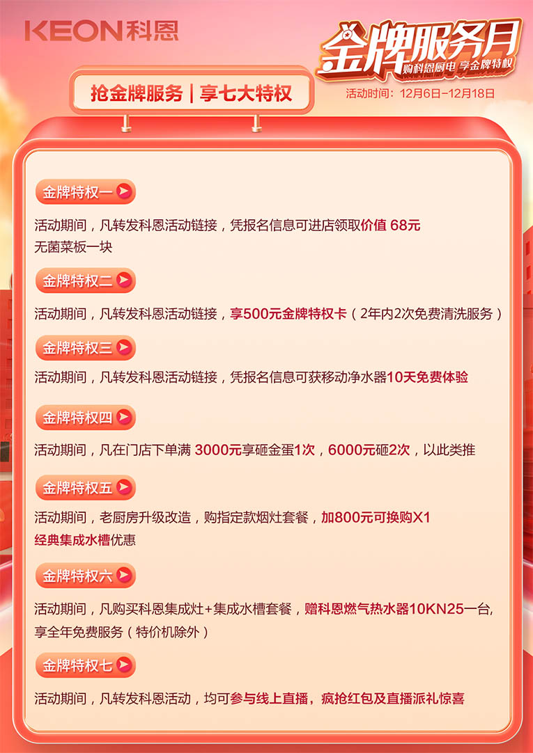 踐行科恩12余年來(lái)一直給予消費(fèi)者的服務(wù)承諾,特此元旦新春佳節(jié)到來(lái)之際,舉辦“金牌服務(wù)月”活動(dòng),購(gòu)科恩廚電,享金牌特權(quán),為您的健康廚房保駕護(hù)航!科恩“金牌服務(wù)月”火熱進(jìn)行中,七大特權(quán)助力活動(dòng)圓滿成功!