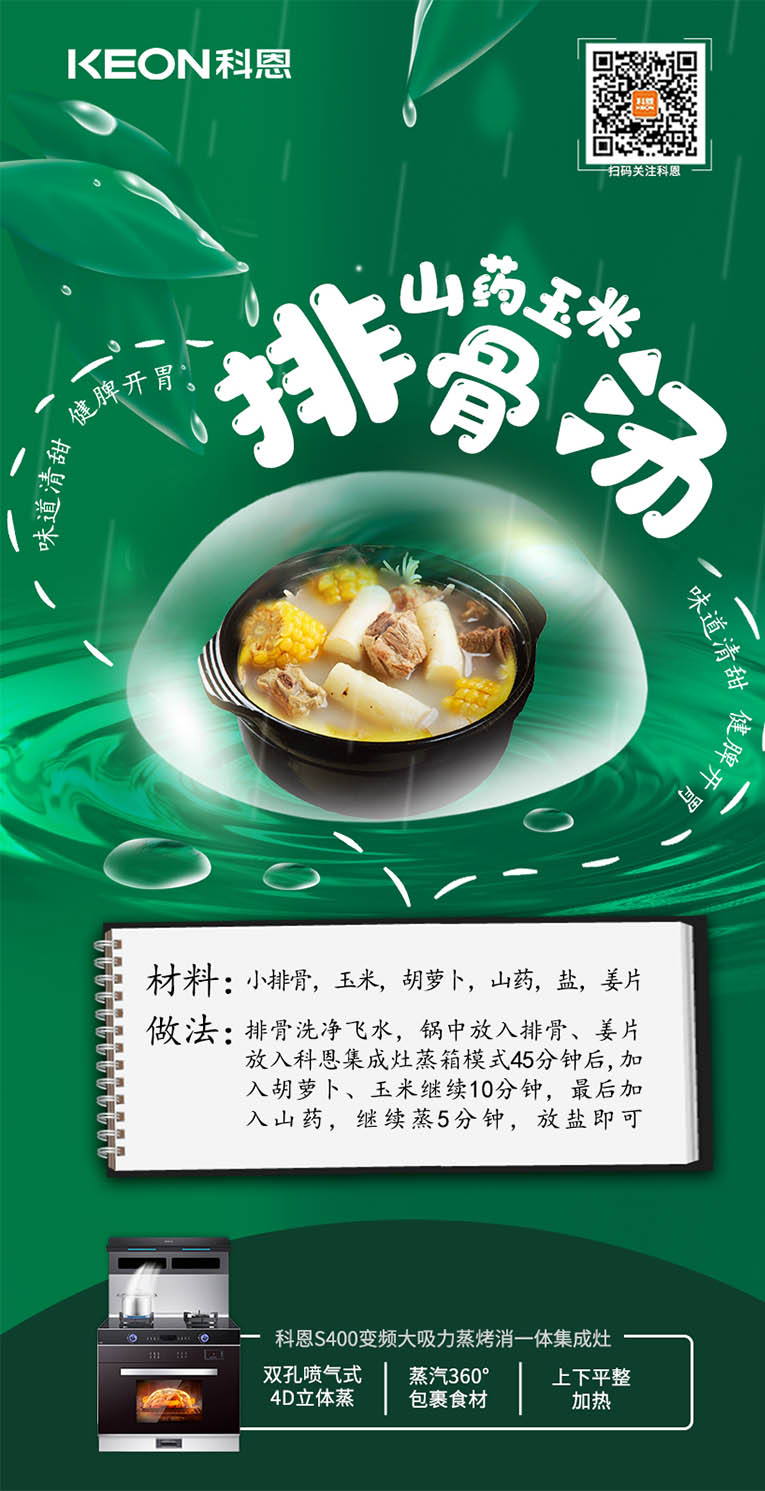 中醫認為肝主生發,故春季肝氣旺盛,肝木易克脾土,養生不當容易損傷脾臟,從而導致脾胃功能的下降。雨水時節空氣濕潤,又不燥熱,正是養生的好時機,當然首先要調養脾胃。集成灶十大品牌、廚電行業十大品牌科恩集成灶多項全能,蒸煮、煲湯、煎炸、爆炒樣樣精通,輕松應對您所需的烹飪方式,20m3/min大風量,720Pa大風壓,只留美味,不留油煙。