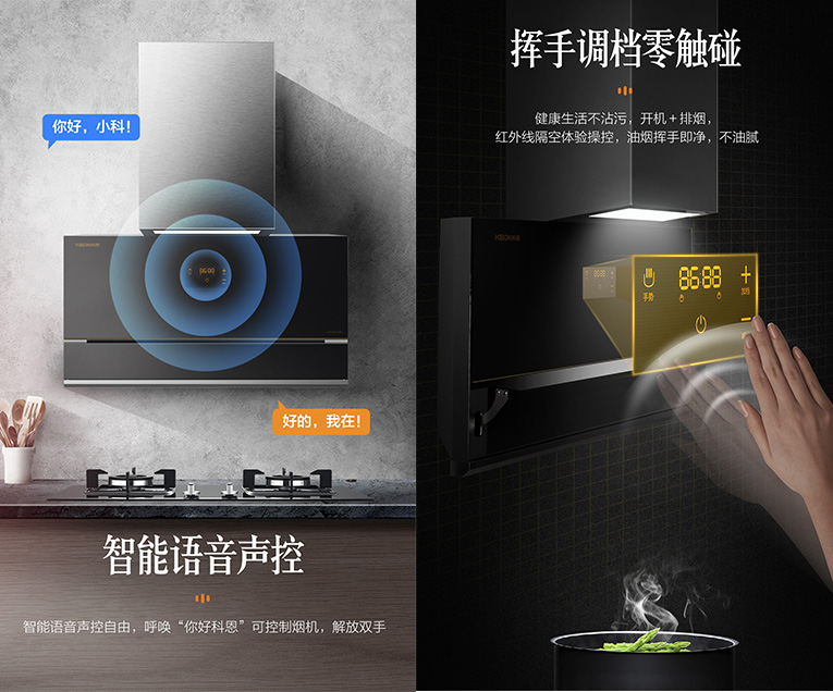 集成灶十大品牌、廚電行業(yè)十大品牌科恩新一代大吸力煙機7350還擁有智能語音控制與體感操控,呼喚“你好小科”可控制煙機。