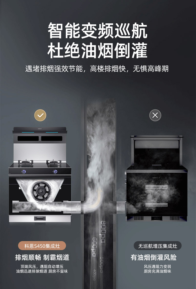 集成灶得以實現(xiàn)高效油煙吸凈率,則是源自對吸油煙方式的改變,將傳統(tǒng)上行排煙升級為側(cè)吸下排,集成灶十大品牌、廚電行業(yè)十大品牌科恩S450變頻大吸力左右蒸烤集成灶20m3/min澎湃大吸力,S級豪華轎車品質(zhì),低空封鎖油煙升騰區(qū),清爽爆炒不過臉,吸凈雙灶爆炒煙,搭載智能變頻巡航系統(tǒng),遇堵排煙強效節(jié)能,高樓排煙快,無懼高峰期。