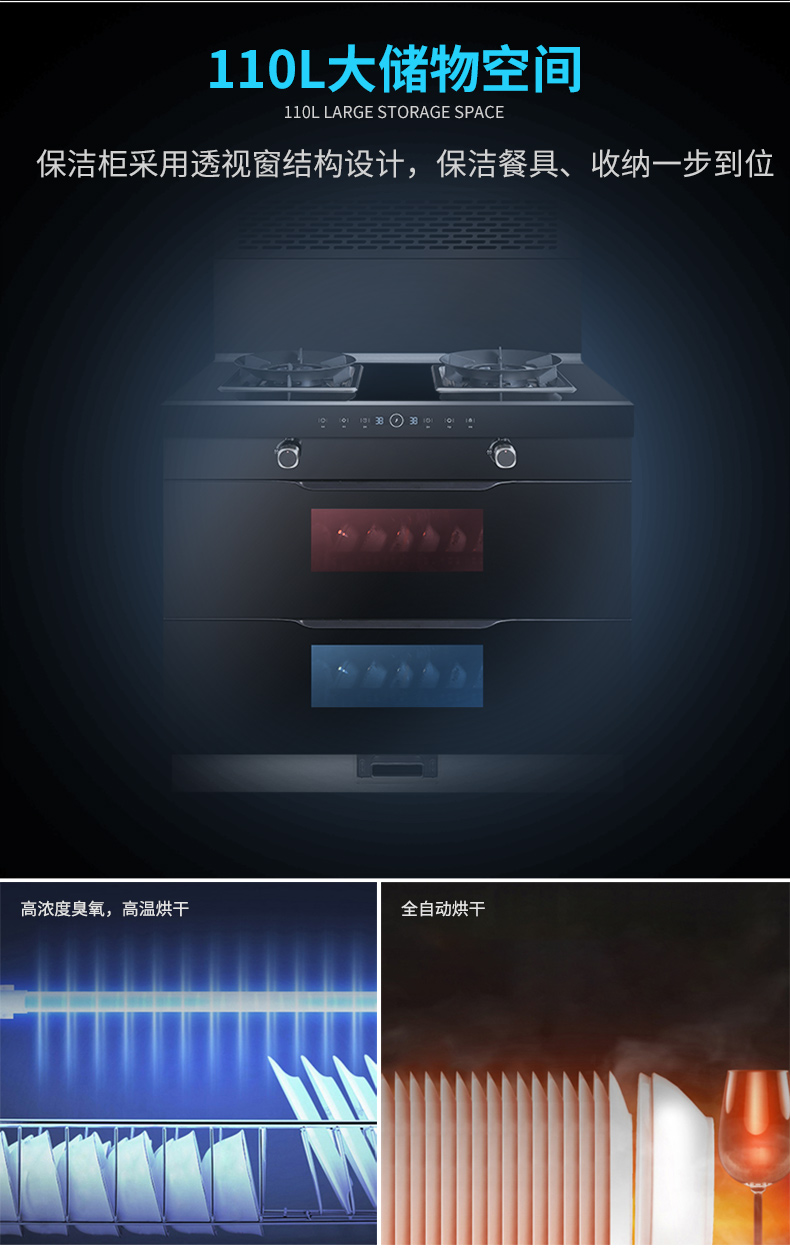 科恩D511下置全景透視窗保潔柜,臭氧+紫外線+紅外線三重保潔,消毒烘干一目了然,假期堆滿山的碗筷,隨洗隨放,一鍵保潔,放心交給科恩D511。