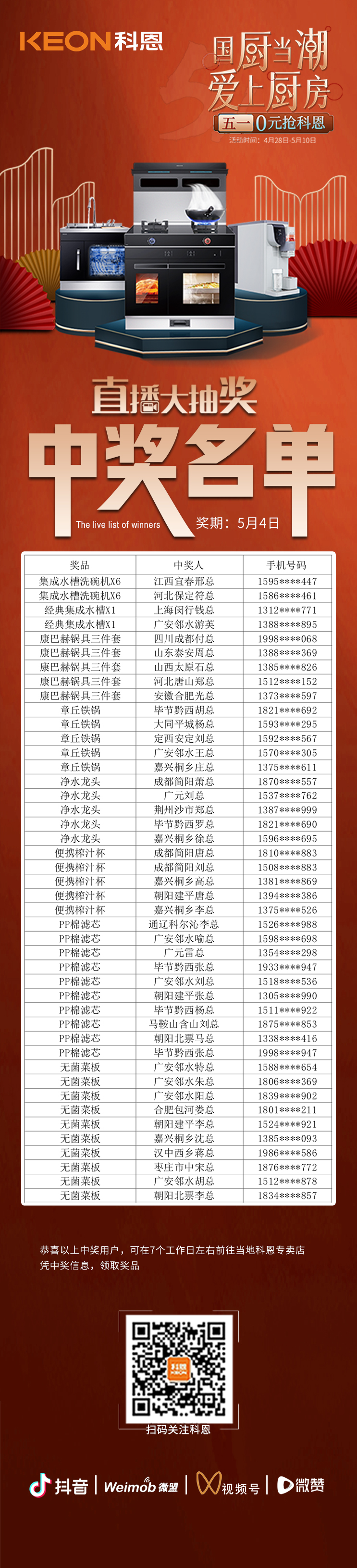 國廚當潮,愛上廚房,0元搶科恩活動火爆進行中(附:5月4日首輪直播大抽獎中獎名單)