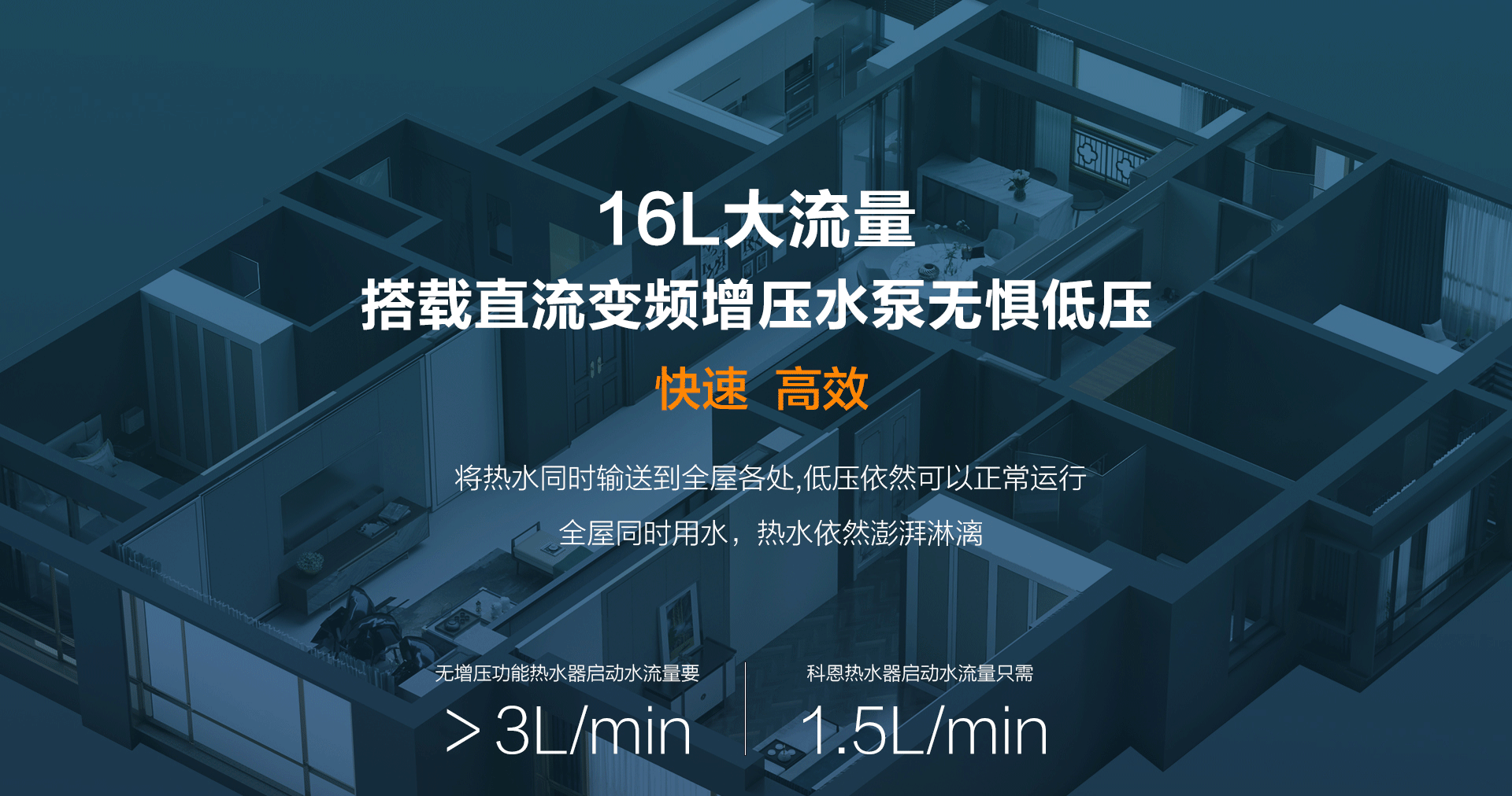 智能增壓,快速高效16L大流量搭載直流變頻增壓水泵,根據(jù)風(fēng)壓智能改變轉(zhuǎn)速,將熱水同時輸送到全屋各處,低壓依然可正常運(yùn)行,全屋多點(diǎn)用水,熱水依然澎湃淋漓,出水更快,更有效率,別墅、高層完全不帶怕的。