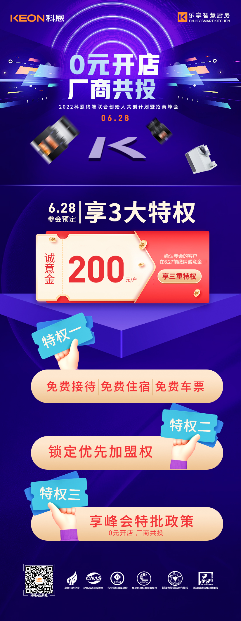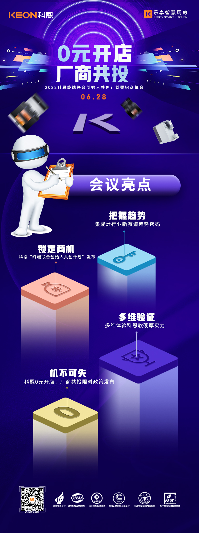 6月28日2022科恩終端聯(lián)合創(chuàng)始人共創(chuàng)計(jì)劃暨招商峰會(huì)將在廚具之都嵊州隆重舉辦,本次峰會(huì)將以“0元開店,廠商共投”為主題,邀請(qǐng)來自全國(guó)各地的行業(yè)精英、投資大佬匯聚一堂,共同探討廚電行業(yè)發(fā)展趨勢(shì),解鎖集成灶行業(yè)新賽道趨勢(shì)密碼,多維驗(yàn)證科恩集團(tuán)軟硬厚實(shí)力,屆時(shí),將為各位來賓解讀限時(shí)政策內(nèi)容,為各位投資人提供一個(gè)潛力無限,共創(chuàng)霸業(yè)的優(yōu)秀共創(chuàng)平臺(tái)。