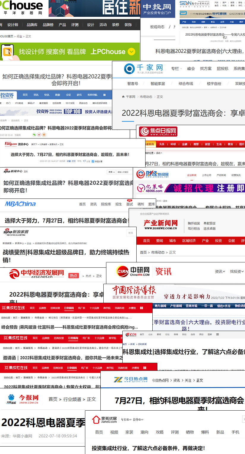 新浪家居、網(wǎng)易家居、太平洋家居網(wǎng)、環(huán)球家電網(wǎng)、廚電行業(yè)資訊、集成灶在線、大眾網(wǎng)、中華網(wǎng)、今報網(wǎng)、財經(jīng)新聞網(wǎng)、中國貿易新聞、經(jīng)濟發(fā)展網(wǎng)、家電消費網(wǎng)、新浪財經(jīng)頭條、中投網(wǎng)、千家網(wǎng)等幾十家重量級媒體爭相報道,2022科恩夏季財富選商會內容躋身熱門話題,引發(fā)全網(wǎng)轟動熱潮,相信本月27日的科恩夏季選商會必將引爆全網(wǎng),熱力滿滿!