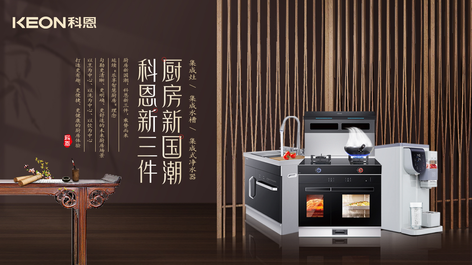 廚房新國(guó)潮,科恩新三件,樂享智慧廚房,科恩電器形成以“集成灶、集成水槽、多功能移動(dòng)凈水器”的科恩新三件,打造廚房新國(guó)潮,于方寸間體會(huì)更多愜意,于細(xì)微處,感受更多用心!