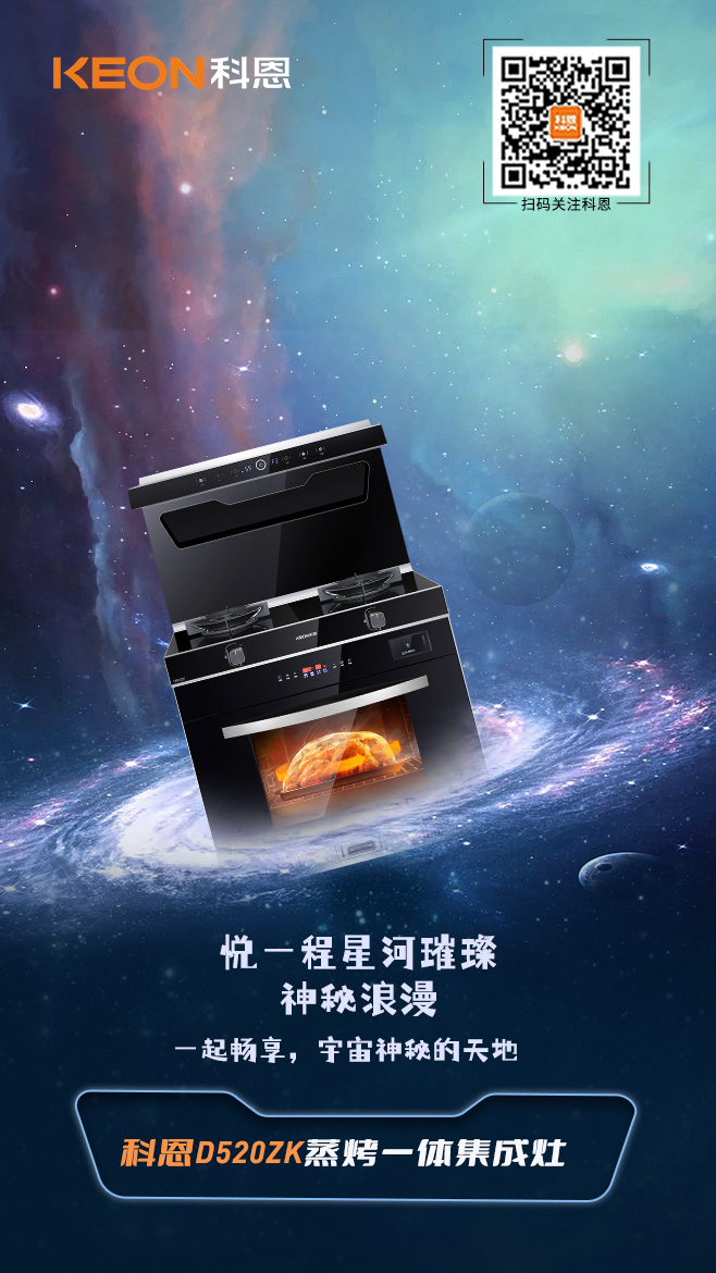 科恩D520ZK蒸烤一體集成灶以星際概念滲透廚房空間,方寸天地縱覽無垠闊境,廚房與星際云端跨界聯動,未來感與前沿科技相得益彰,科恩D520ZK由此誕生。