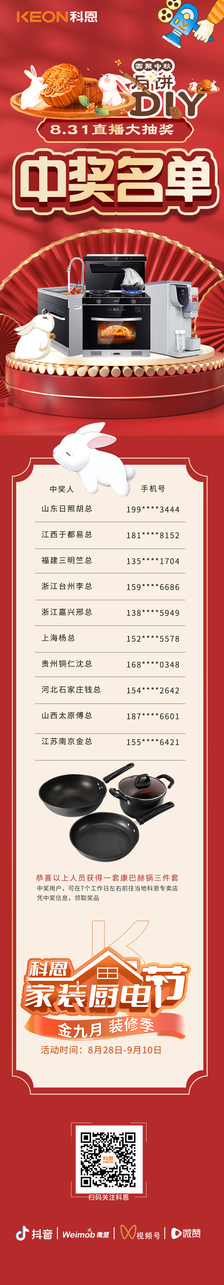 8月31日晚7點(diǎn),科恩家裝廚電節(jié)直播第一期——圓聚中秋,月餅DIY已順利錄下帷幕,直播現(xiàn)場(chǎng)精彩紛呈,不僅有主播手把手教做科恩私房月餅,更有購1元廚電特權(quán)卡抽大獎(jiǎng)活動(dòng)!此時(shí)此刻,想必屏幕前的你們一定非常關(guān)注獲獎(jiǎng)結(jié)果,話不多說,快來看看,這次獲獎(jiǎng)名單中有你嗎?
