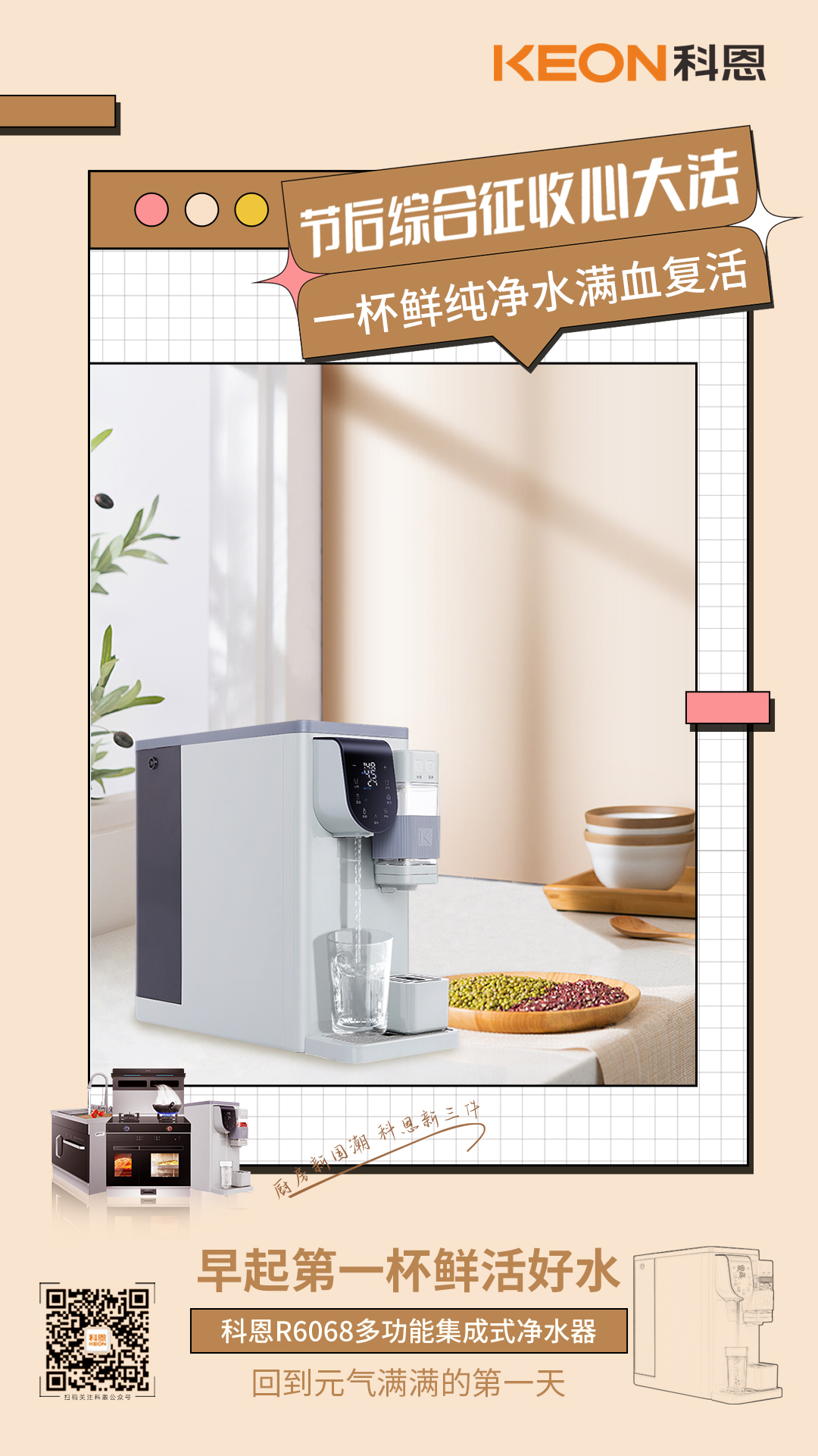 國慶長假,熬夜晚起定時常態,你需要一杯鮮活好水,煥新身體細胞,回到元氣滿滿的第一天!科恩R6068多功能集成式凈水器,一鍵適配不同飲水需求,溫度水量皆可調控,百變泡飲,滴滴鮮醇,RO精濾,UV殺菌,精濾至微,暢飲無憂,健康隨行!