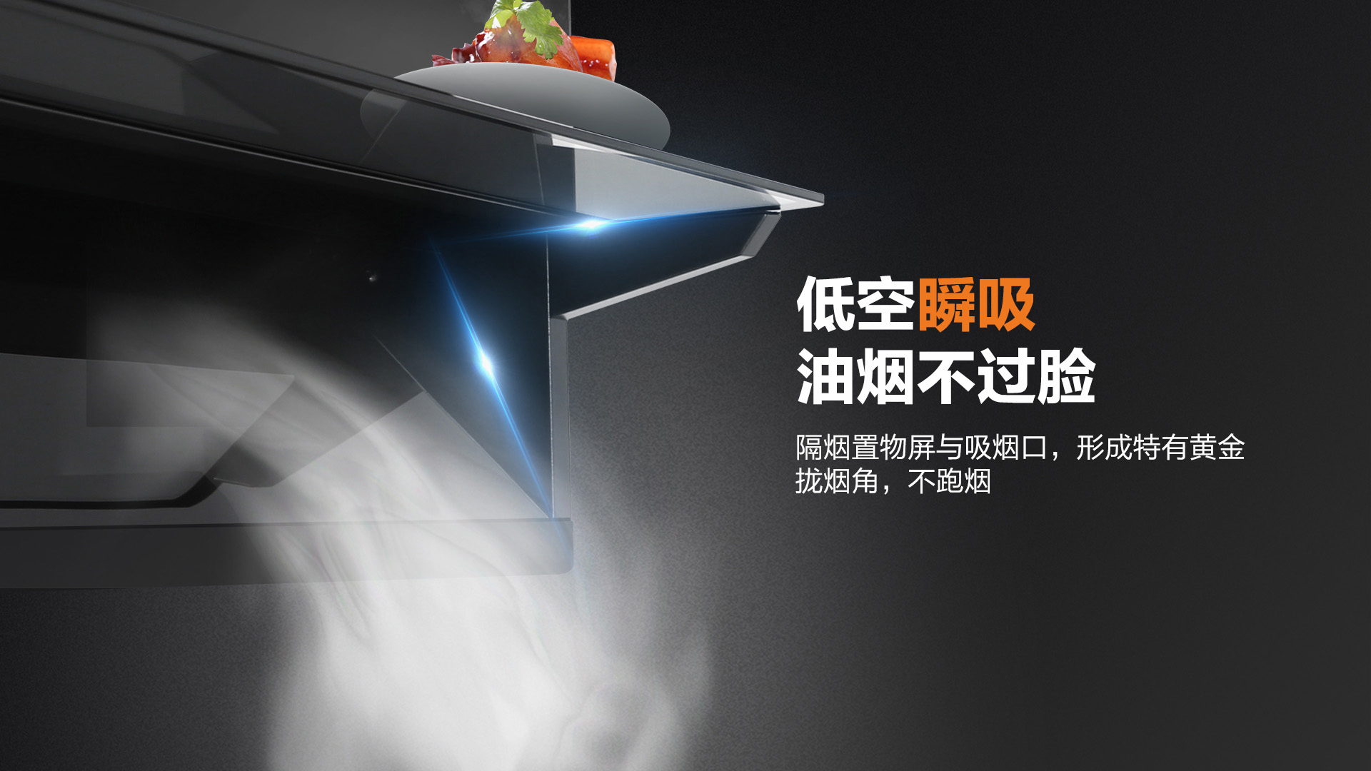 特制的導煙置物板,更是阻絕油煙向上跑的可能,徹底做到油煙不過臉。且在導煙同時,還能置物,烹飪時隨手置放的調味品有了好去處!