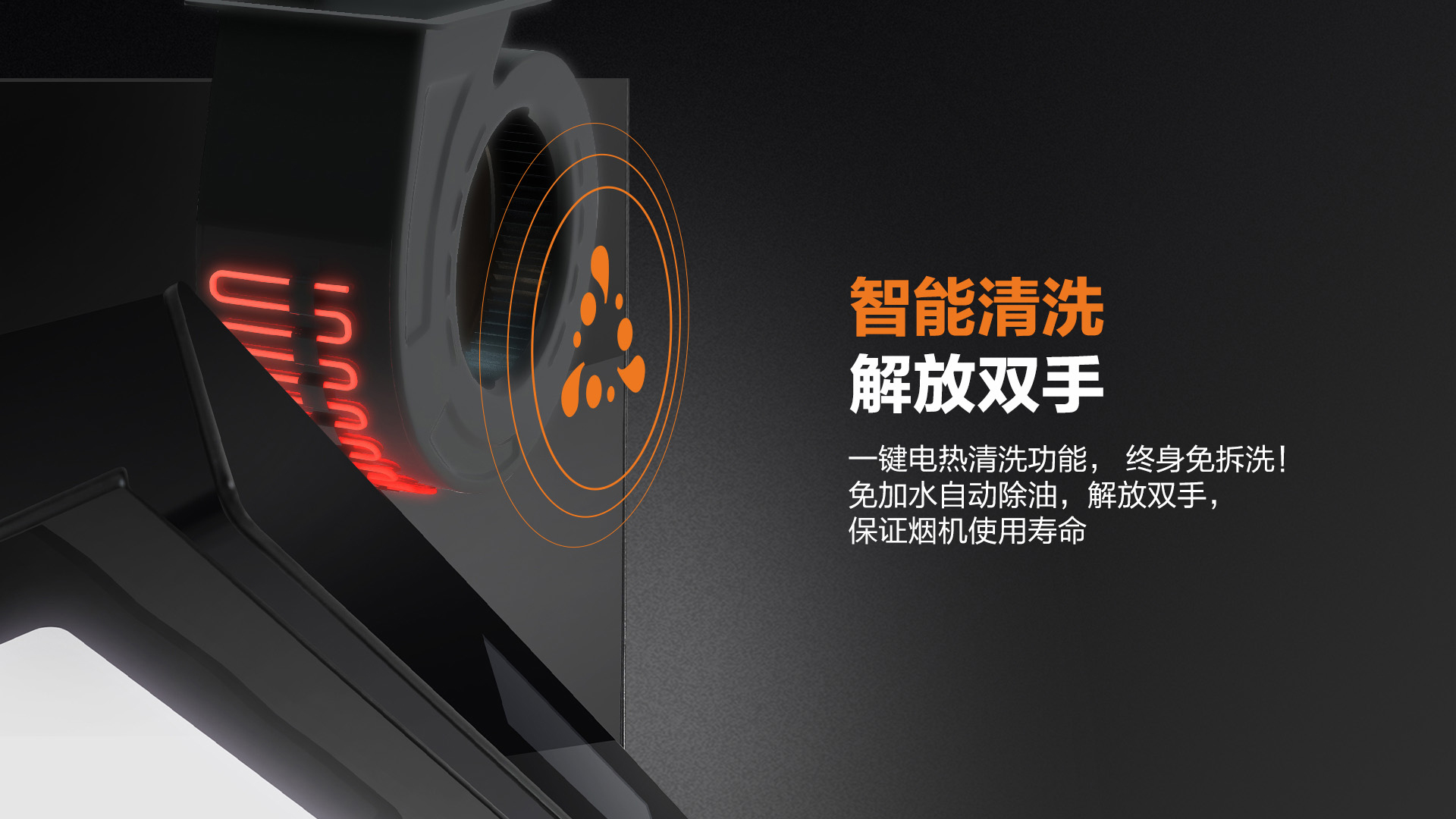 輕輕一按,開啟自動電加熱清洗,免加水自動除油,解放雙手,保證煙機使用壽命