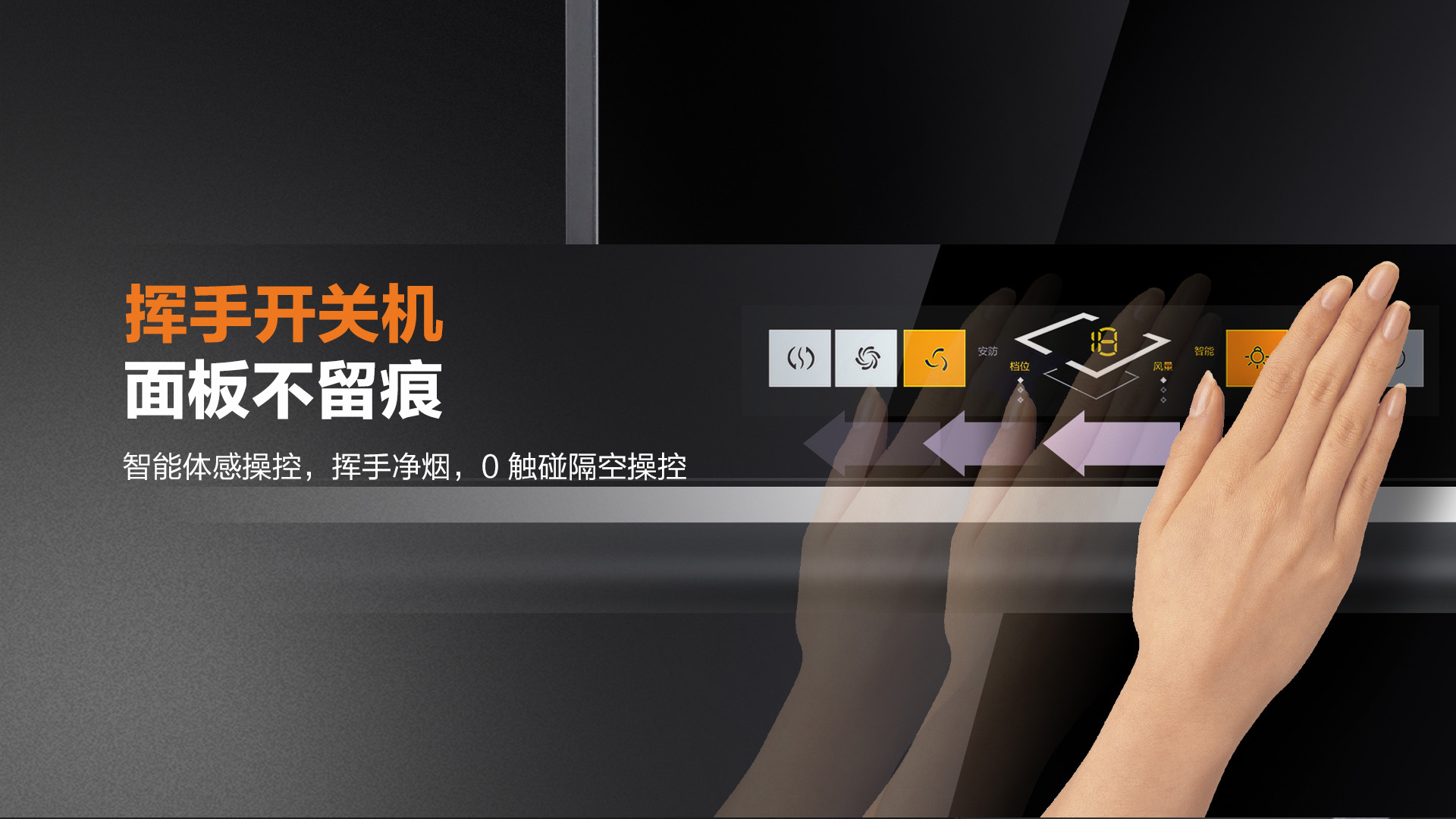 揮手開關機,面板不留痕,智能體感操控,揮手凈煙,0觸碰隔空操控,廚房更潔凈!