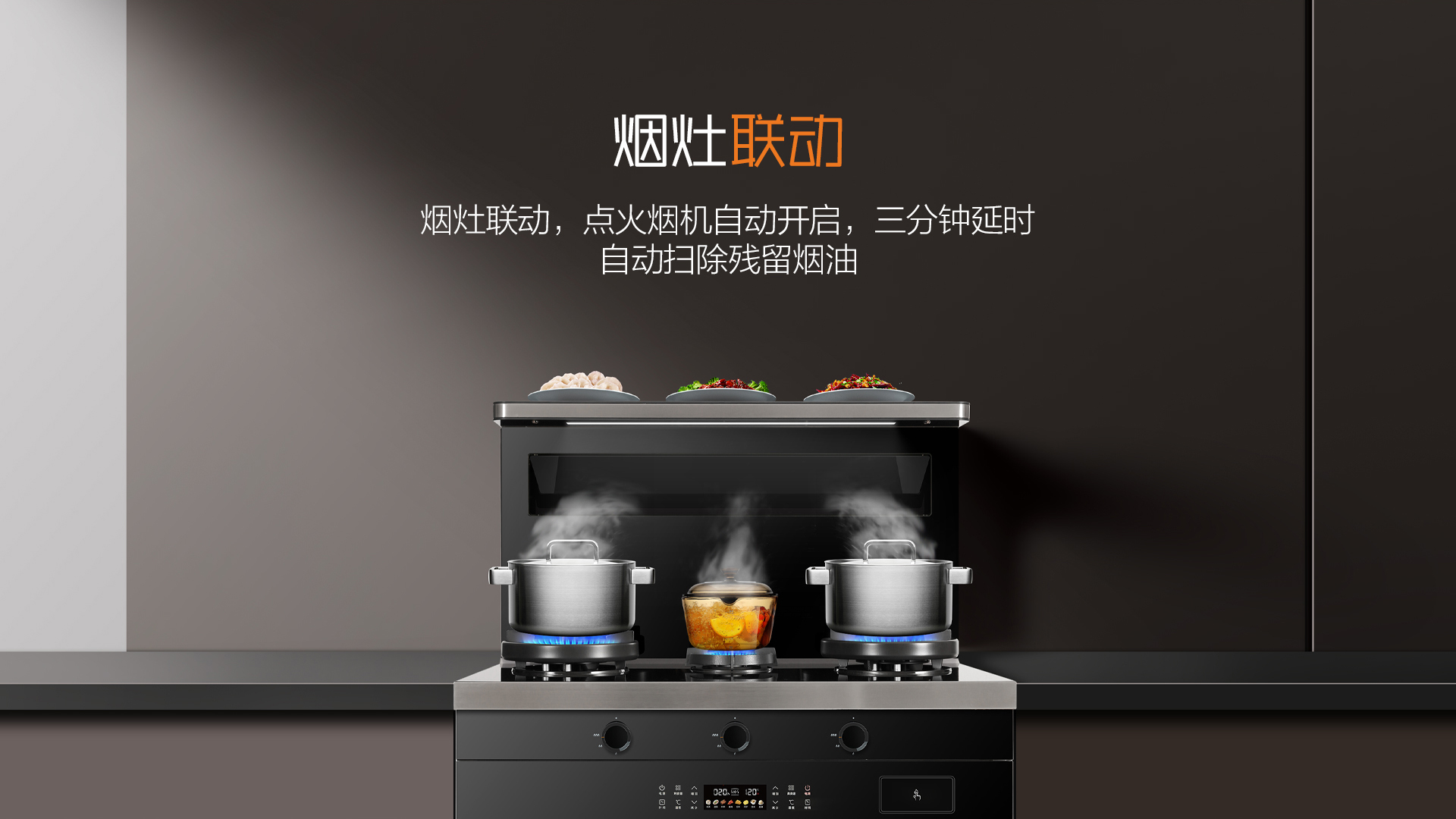 與普通煙灶聯動不同,A3系列打開灶具的同時煙機與照明燈同時打開,且煙機可根據火力大小自動調節,無需再手動調節,風隨火動廚房更智能。