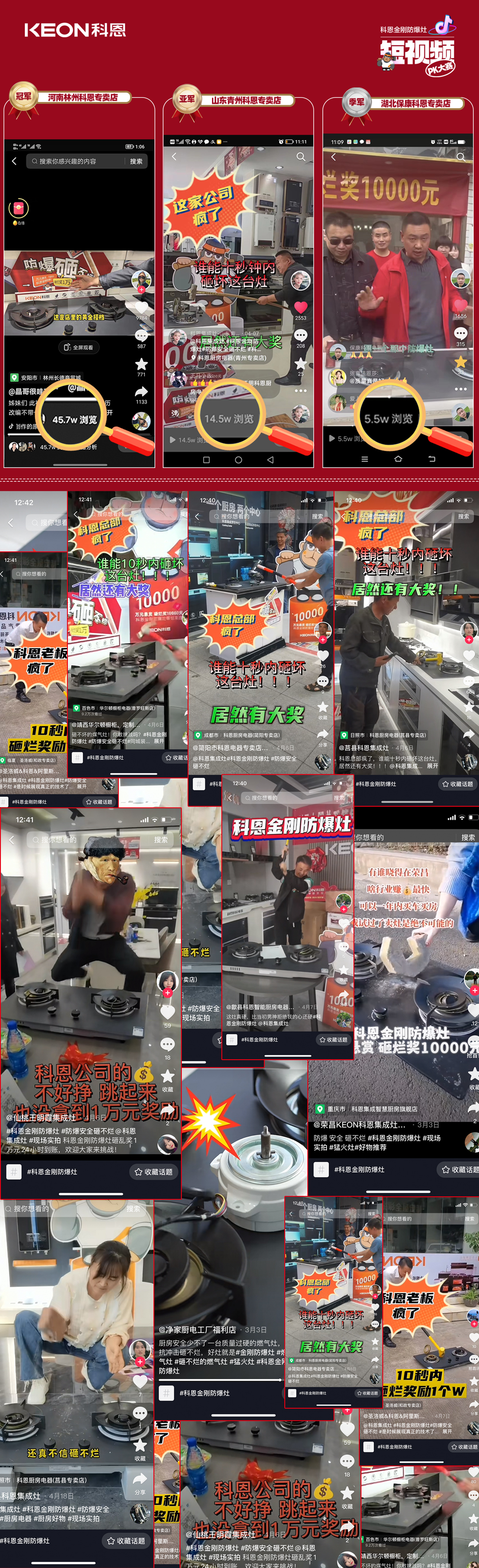 歷時一個月的科恩金剛防爆灶抖音挑戰賽終于落下帷幕!比賽評審工作也已結束,經銷商家人們都取得了不錯的成績。