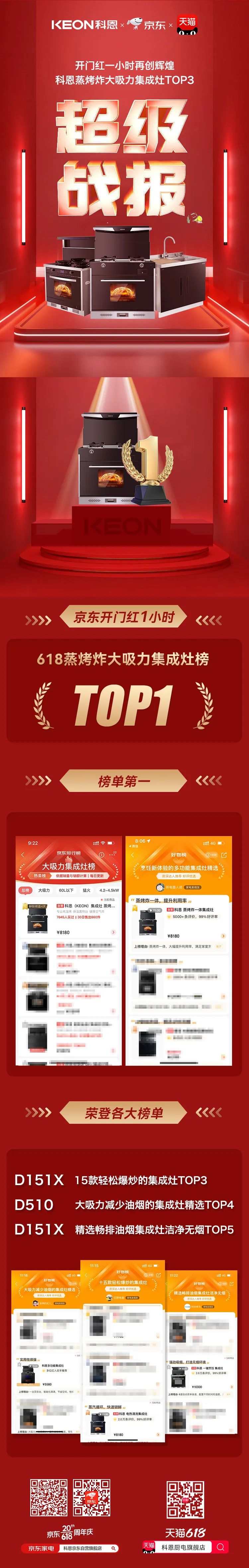 5月31日20:00,618開門紅正式開啟。在這場各大品牌的“首波交鋒”中,科恩集成灶表現(xiàn)尤為亮眼。截至5月31日21:00,科恩集成灶斬獲京東蒸烤炸大吸力集成灶TOP1,蟬聯(lián)第一!