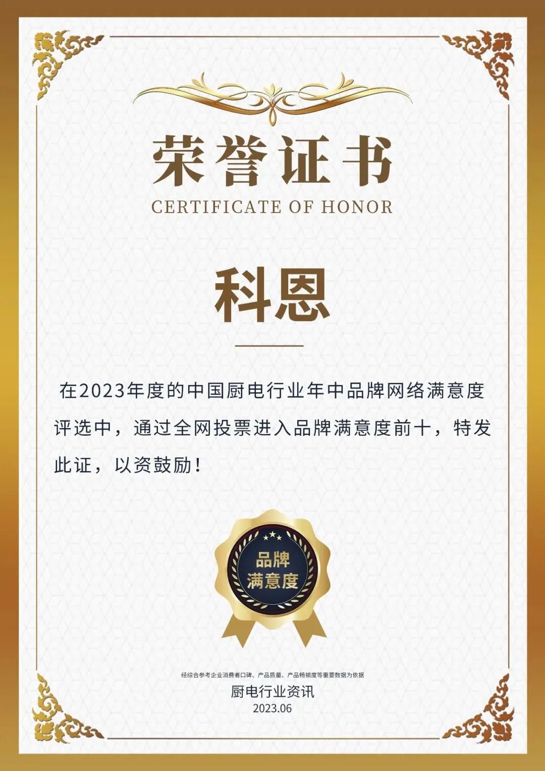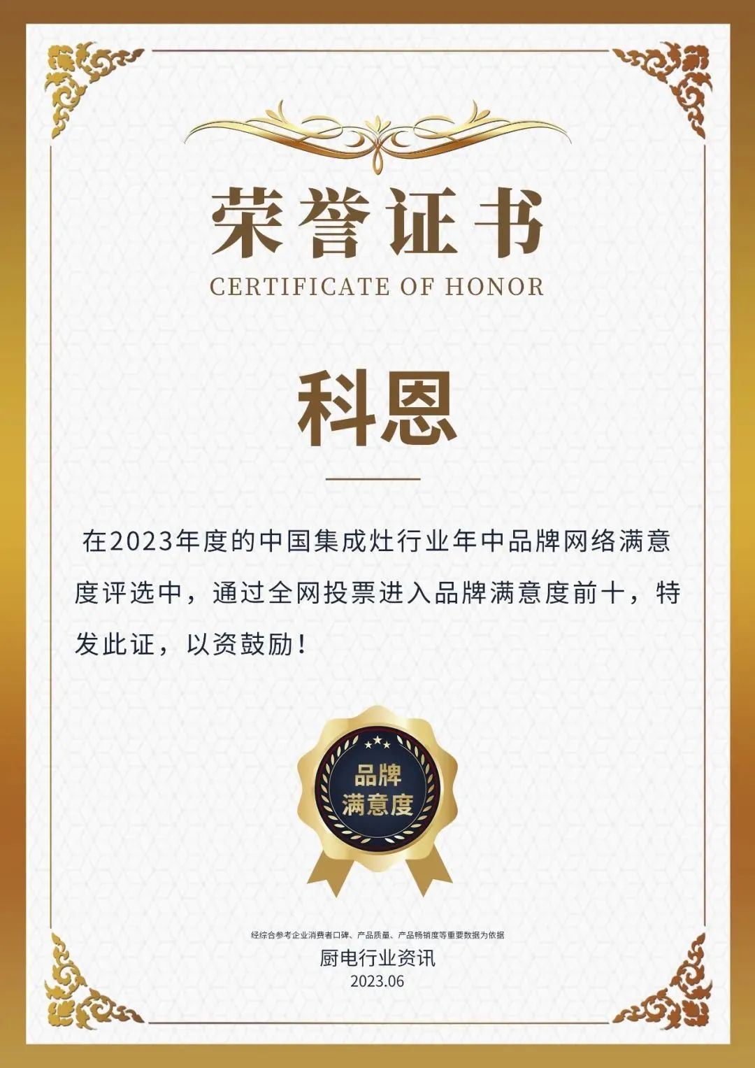 6月16日,浙江科恩電器有限公司再度榮獲“2023年度中國廚電行業(yè)品牌年中網(wǎng)絡(luò)滿意度前十”、“2023年度中國集成灶行業(yè)品牌年中網(wǎng)絡(luò)滿意度前十”!