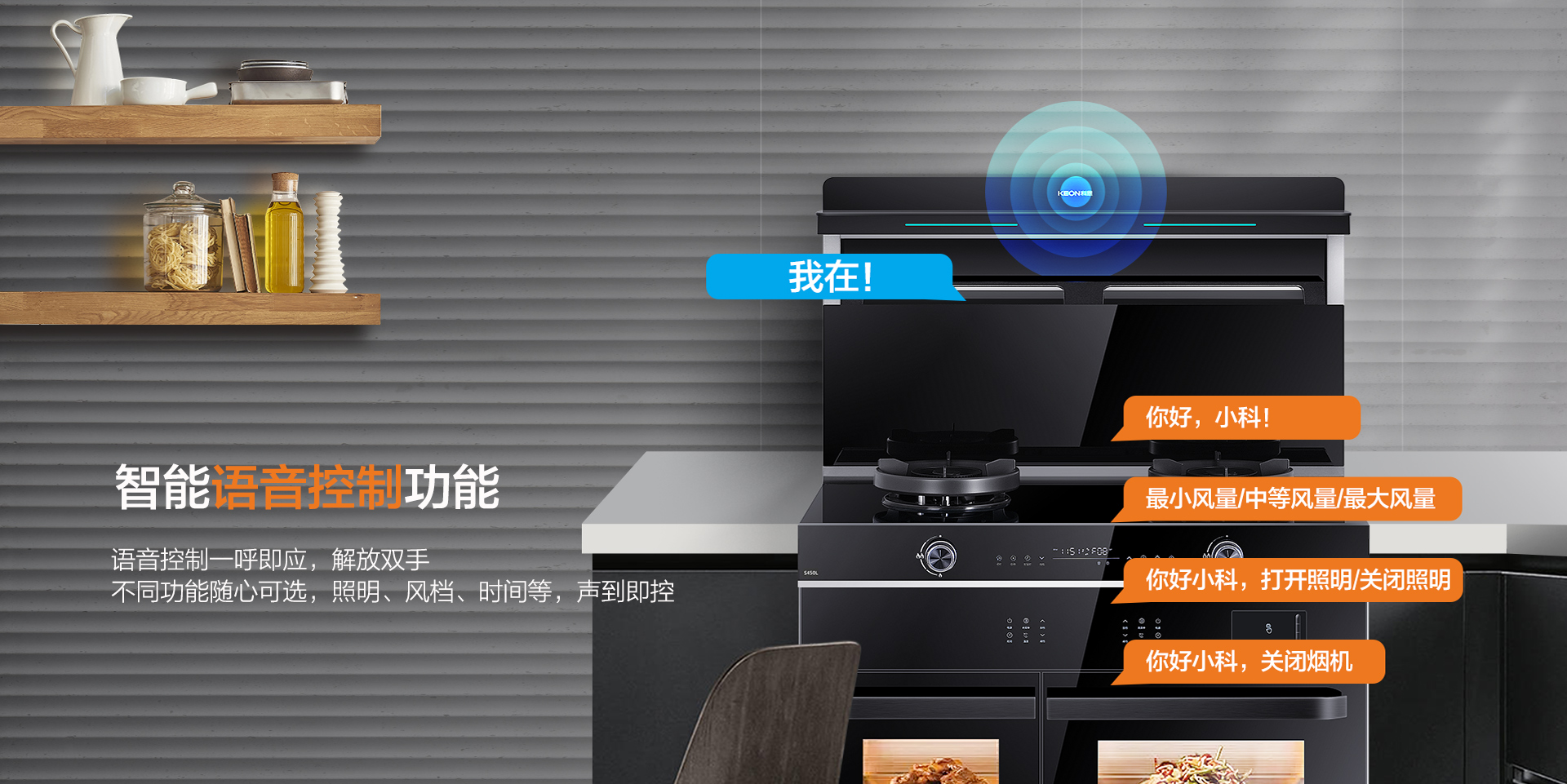 開啟烹飪從一聲你好,小科!開始。語音控制一呼即應,解放雙手,不同功能隨心可選,照明、風擋、時間等,開口即可操作。
