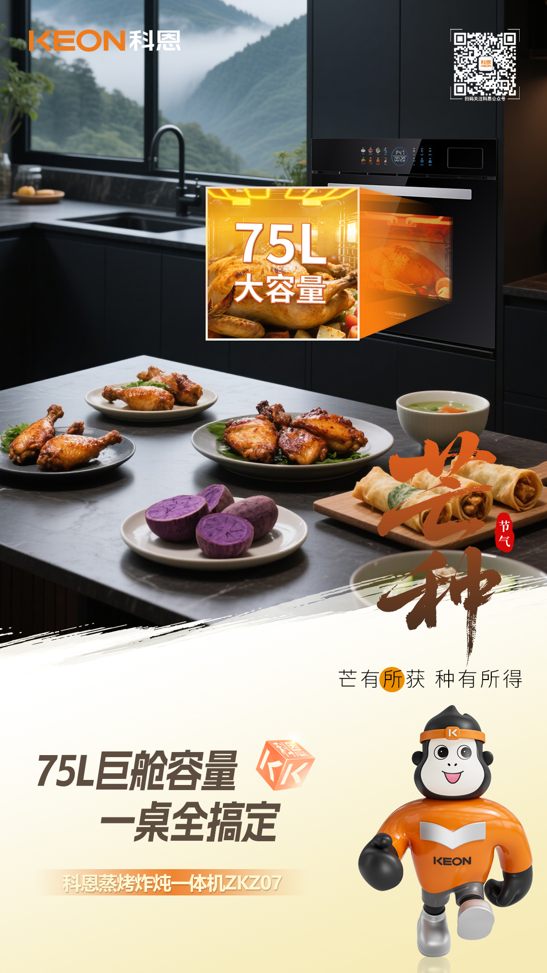 仲夏蟬鳴起,新麥入倉時芒種麥香濃,廚房煥新章科恩匠心推出ZKZ07蒸烤炸燉一體機,用科技重新定義烹飪藝術,讓每一道菜都成為時令佳作,為家人帶來舌尖上的驚喜!