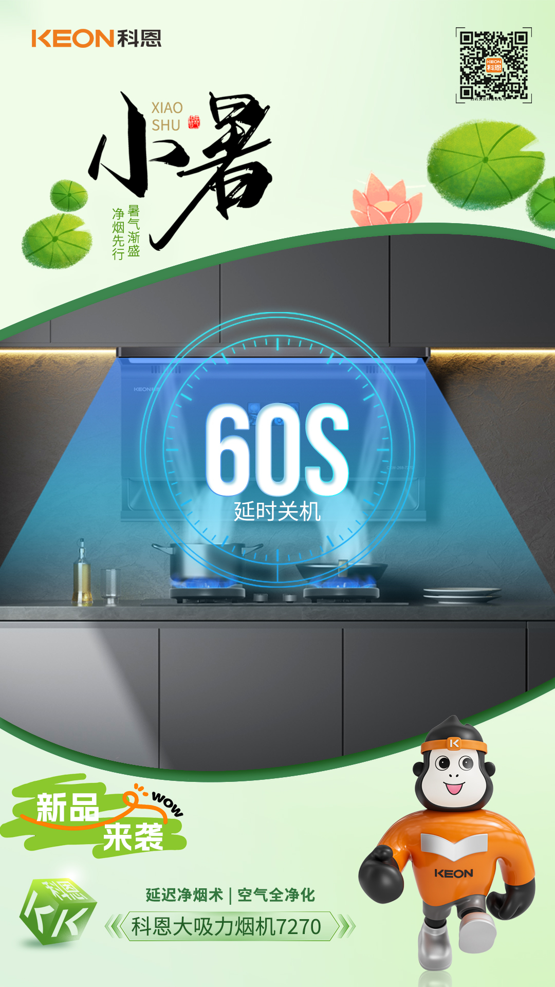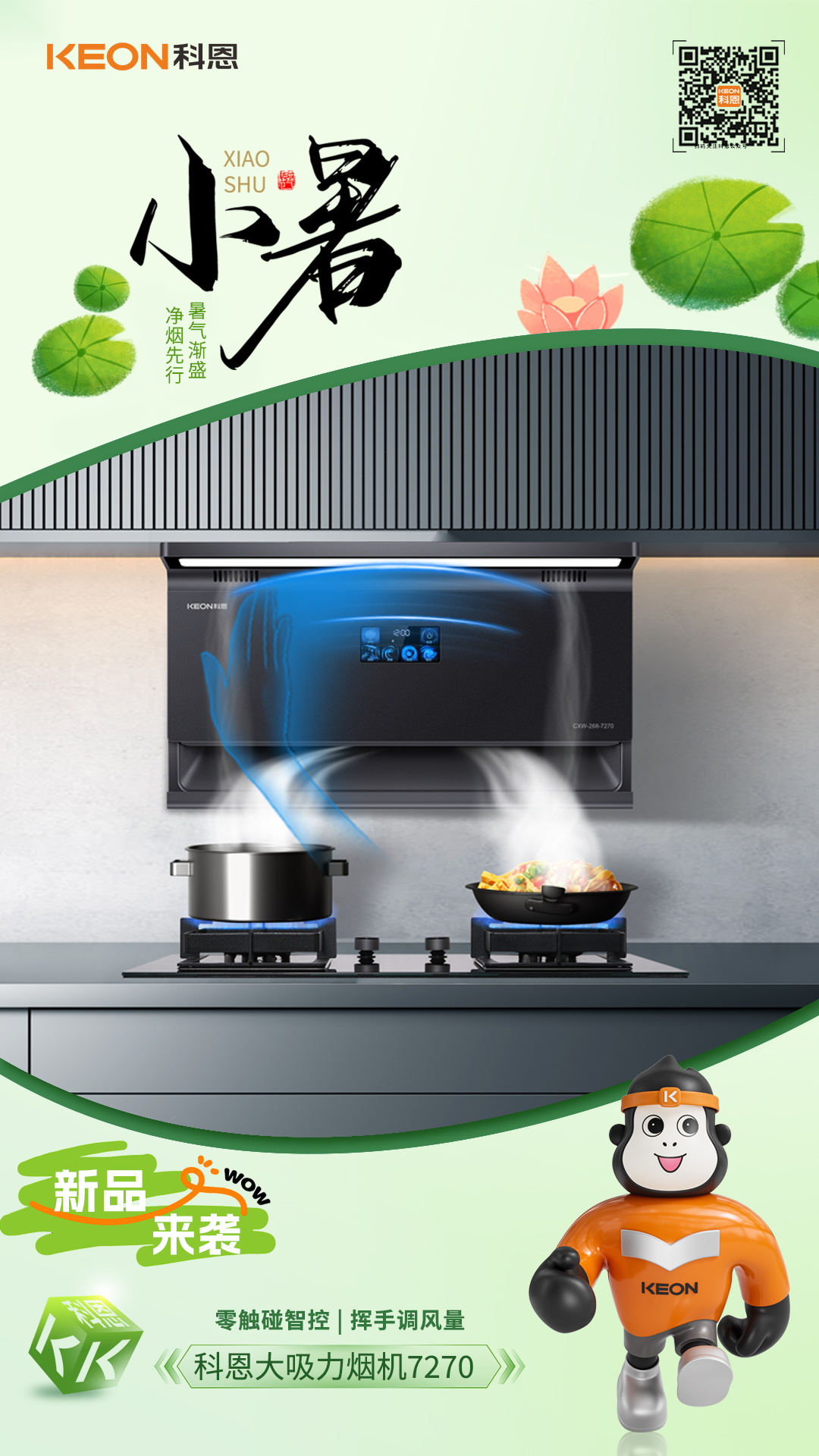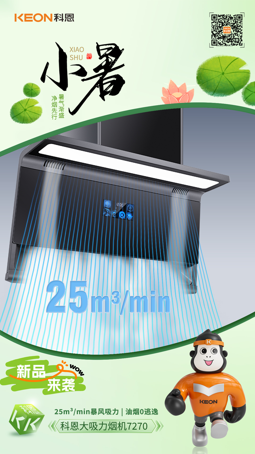 蟬鳴初起,熱浪翻涌。小暑時(shí)節(jié)廚房成高溫重災(zāi)區(qū),油煙升騰中包裹著暑氣更顯煩躁,科恩7270煙機(jī)攜25m³/min暴風(fēng)吸力來(lái)襲,為廚房筑起清涼防線,讓凈煙快一步,生活慢享受。