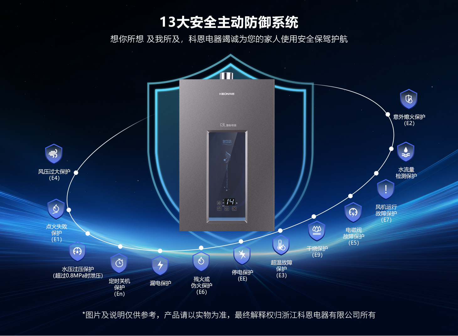 靜音節(jié)能,綠色安心。智能分段燃燒技術(shù),讓沐浴始終宜人,風機低速運行超靜音,享受寧靜的沐浴體驗,熱效率高達89%以上,節(jié)能更環(huán)保,老房高層也能暢享穩(wěn)定熱水。十三重護,安全無憂。13重全天候安全保障,守護全家溫暖,過熱、過壓、熄火保護三重防護,意外停電或煙道堵塞時自動斷氣,定時關(guān)機保護,蜂鳴提⽰及報警功能,全面杜絕安全隱患,專注享受沐浴無后顧之憂。