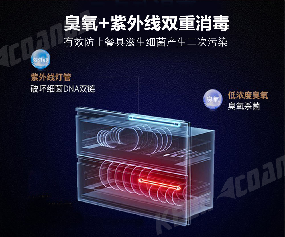 • 臭氧+紫外線雙重消毒設計,有效防止餐具滋生細菌產生二次污染等風險