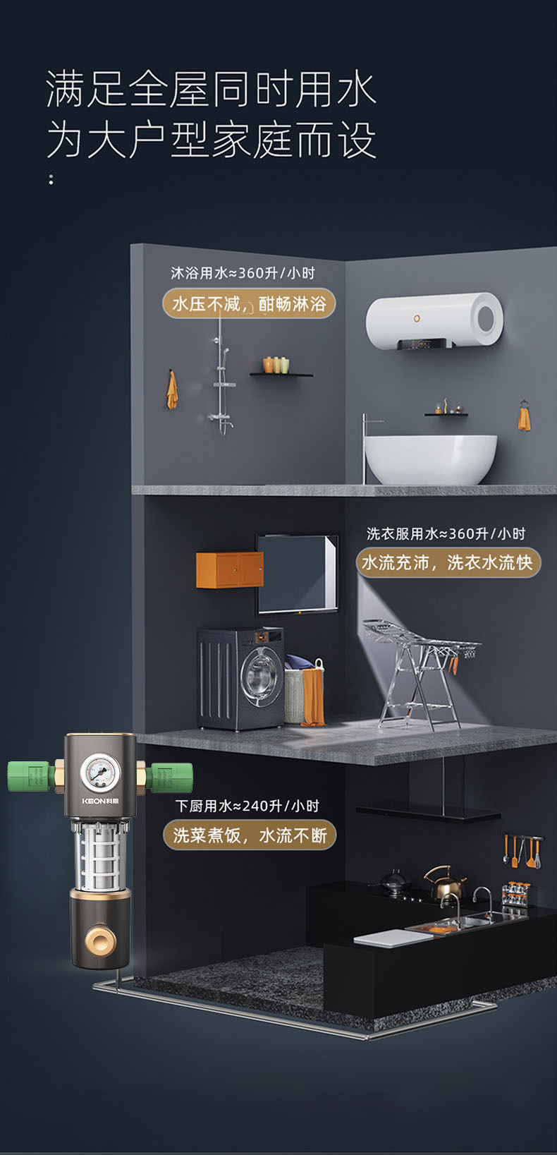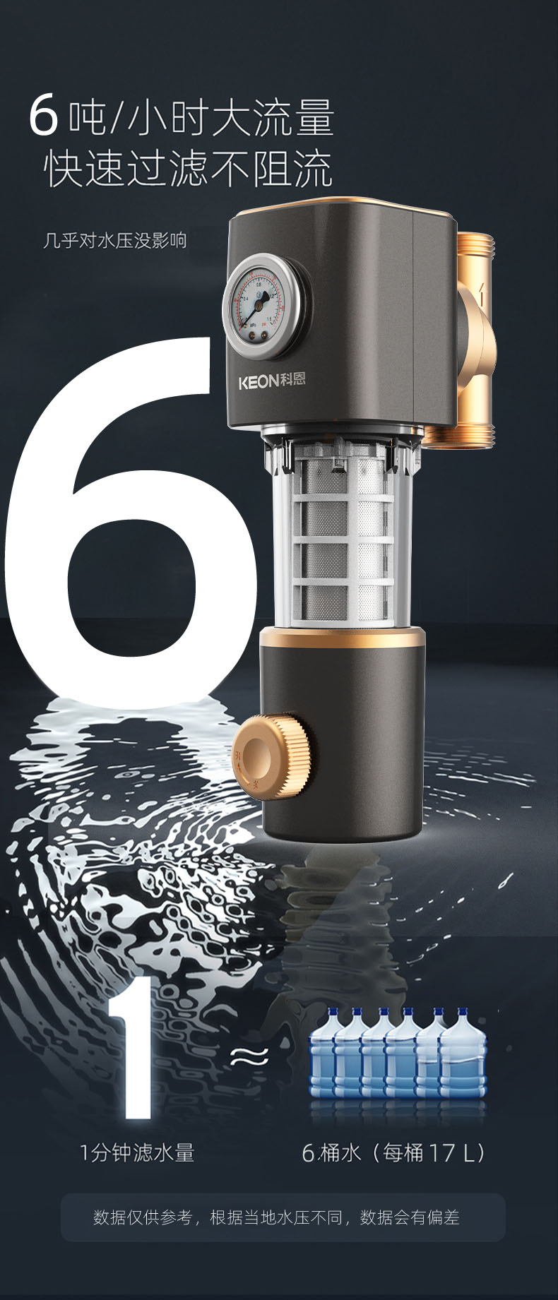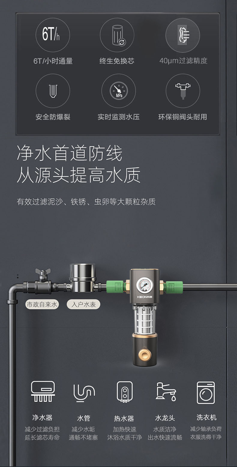 - 6噸/小時大流量,快速過濾,全屋用水無壓力