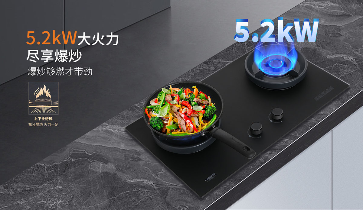 - 360°全維進(jìn)風(fēng),立體補(bǔ)氧,5.2kW大火力盡享爆炒